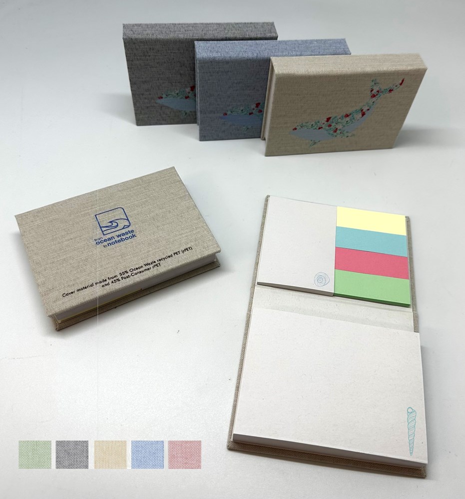 Hardcover 10,8x8 cm Cover mit Gewebe-Einband hergestellt aus recyceltem Kunststoff-Abfall aus den Weltmeeren in 6 Standardfarben: Sand, Blau, Grün, Grau, Rot Blindprägung auf Frontcover max. 100 cm² oder 1c Haftnotizen 102*x74 mm - 100 Blatt - 1-2c Haftnotizen 51*x74 mm - 25 Blatt - 1-2c Papier-Index 18*x50 mm - 4x25 Stück Pastellfarben aus unseren Standard-Farbsortiment