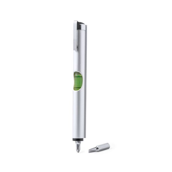 Praktisches Multitool aus Aluminium, mit integriertem Füllstandsmesser im Gehäuse und zwei Schraubendreherköpfen (Flach- und Kreuzschlitzschraubendreher) im Inneren. Mit verchromtem Metallclip und präsentiert in einer Kraft-Designbox.