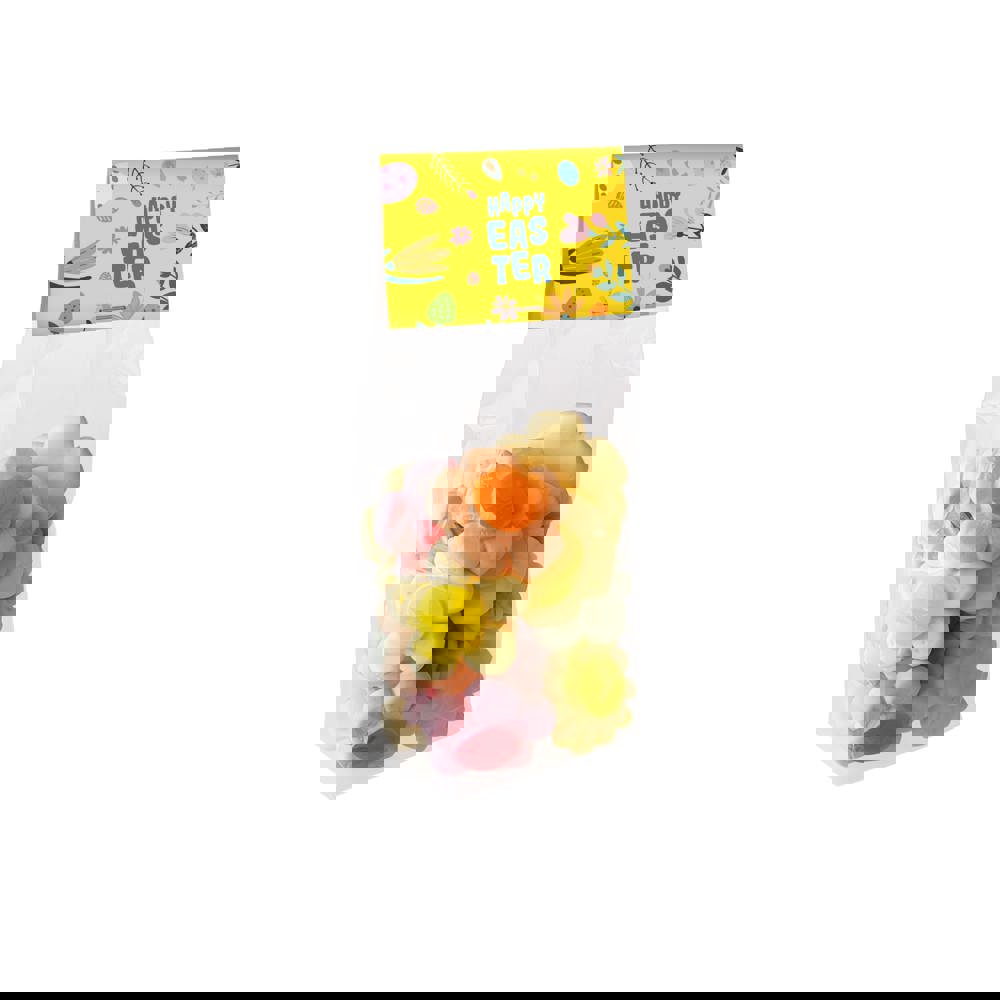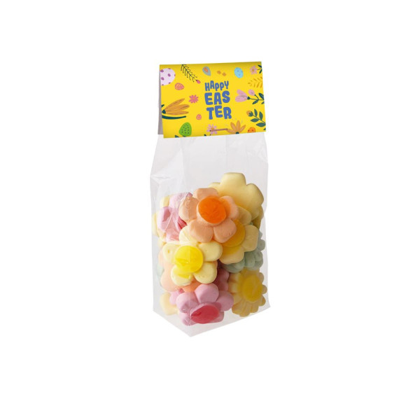 Transparenter Blockbeutel mit 4c-Euroskala bedruckter Topkarte, gefüllt mit ca. 150 Gramm Fruchtgummi Blumen