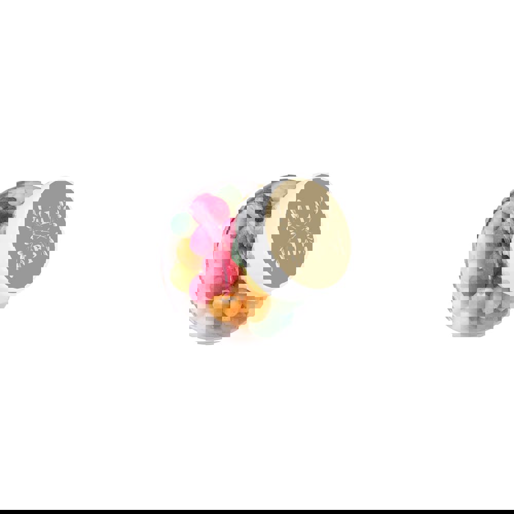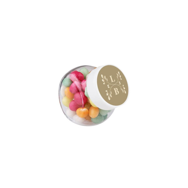 Mikro Glas 50 ml mit weißem Deckel gefüllt mit Farbige Zuckereier und einem 4c-Euroskala Aufkleber auf Deckel