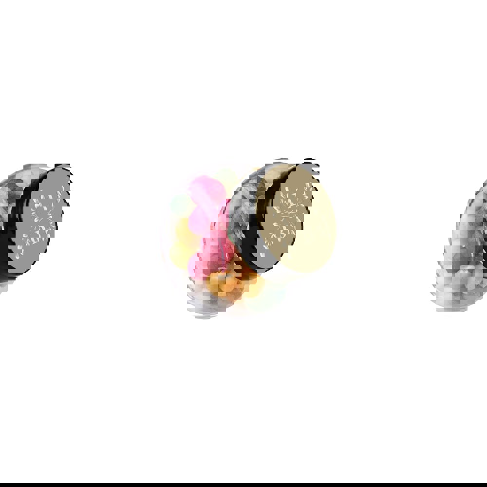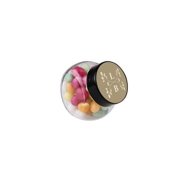 Mikro Glas 50 ml mit schwarzem Deckel gefüllt mit Farbige Zuckereier und einem 4c-Euroskala Aufkleber auf Deckel