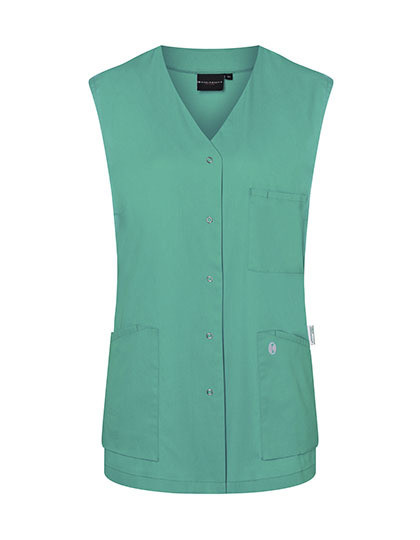 Köpergewebe, 150 g/m² | Waschecht, pflegeleicht, nachhaltig | Damenkasack ohne Ärmel und mit V-Ausschnitt | Polyesteranteil aus recyceltem Plastik | Besonders leichter Stoff für ein angenehmes Tragegefühl im Berufsalltag | Waschbarkeit bei 95°C | Leicht tailliert geschnitten | 2 aufgesetzte Seitentaschen mit verdeckter Innentasche rechts | 1 Schlaufe in der Seitentasche zur Anbringung einer Schlüsselkette | 1 aufgesetzte Brusttasche links mit Stiftfach | 5 zentrale Druckknöpfe zum Verschließen des Kasack | Grüner Knopf zertifiziert, www.g-k.eu/karlowsky