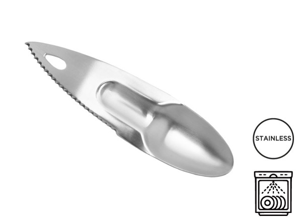 - Die gezahnte Klinge auf einer Seite des Griffs ermöglicht es, eine Kiwi, eine Avocado, oder jede andere Frucht mit diesem Fruchtbesteck zu schneiden und anschließend mit der Löffelseite zu genießen.