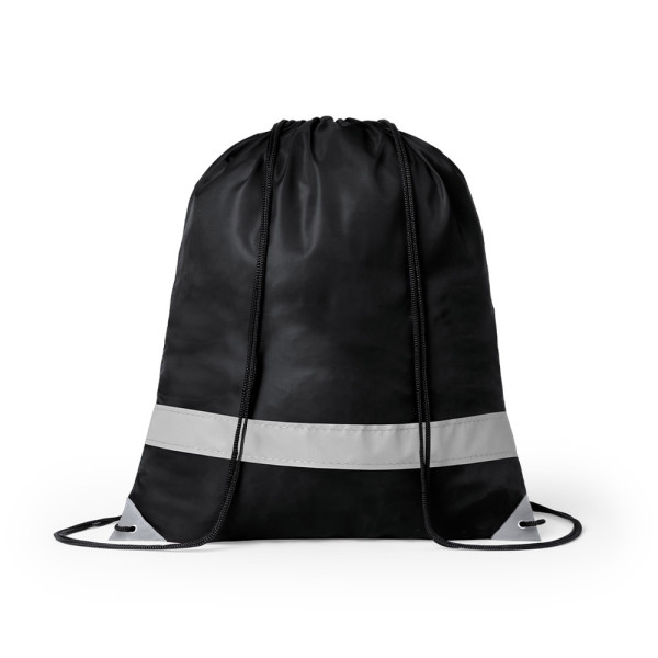 Reflective backpack in soft polyester 190T in bright tones, with reflective front strip. Self closing black strings and reflective corners reinforced with metal rings.