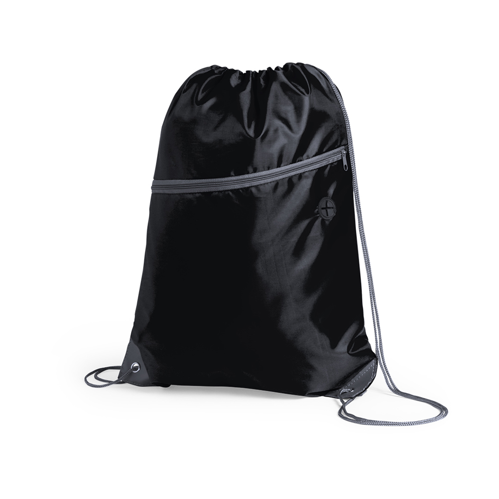 Drawstring backpack made of soft 210D polyester. With front zipped pocket and headphone outlet. Self-closing strings in grey colour, matching zip and corners with metal eyelets and PU leather reinforcement. Avaiable in a wide range of colours.