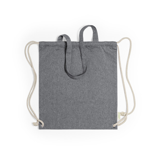 Nature line drawstring backpack bag in durable 140g/m2 recycled cotton, with matching 70 cm lenght carrying handles. Natural color cotton strings, with reinforced metal eyelets and recycled cotton label. Available in a wide range of colours. Resistance up to 9kg in weight.