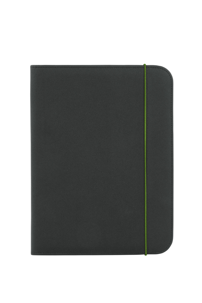 black conference folder with organizer features; closes with coloured elastic band; writing pad; flat insert pocket; elastic band for pens