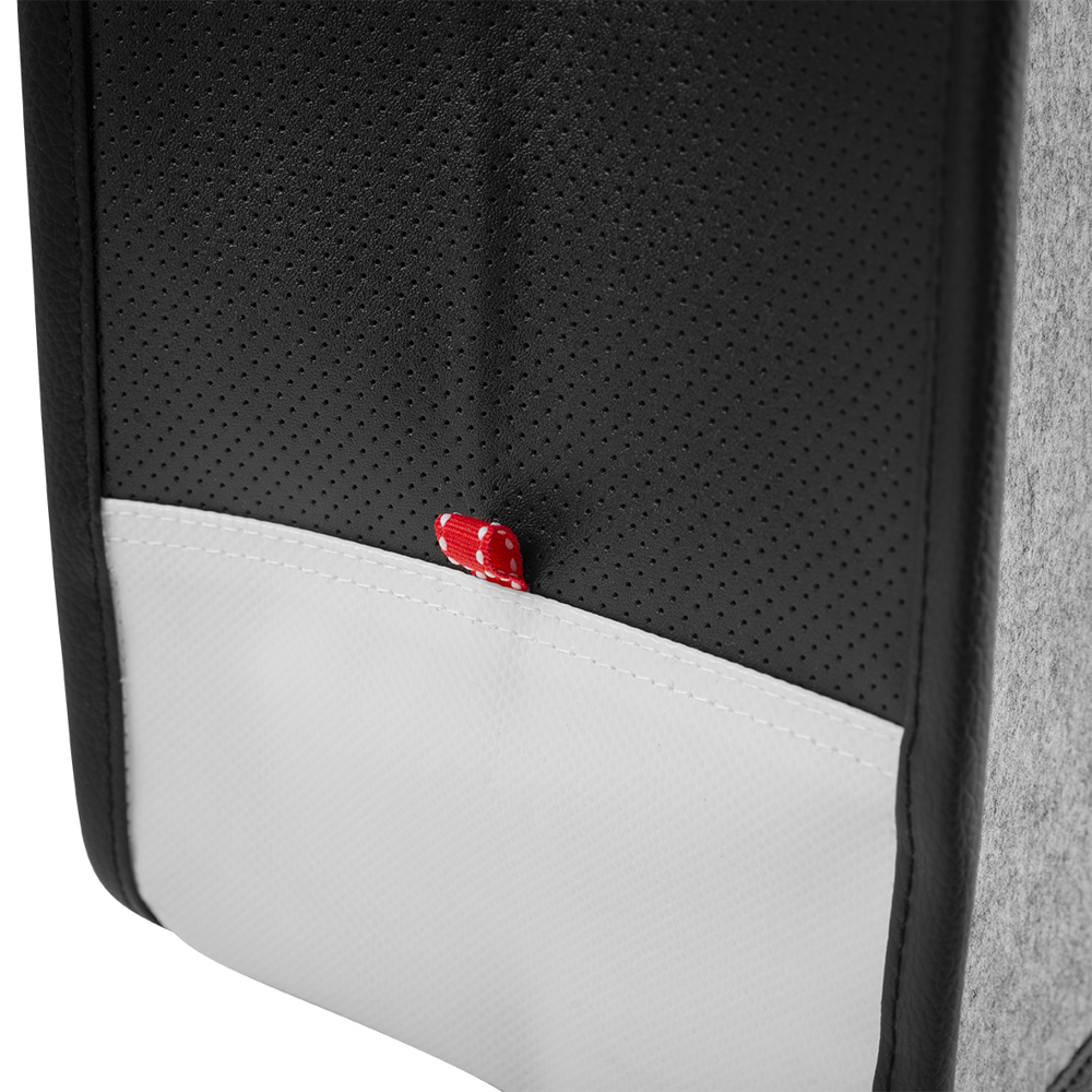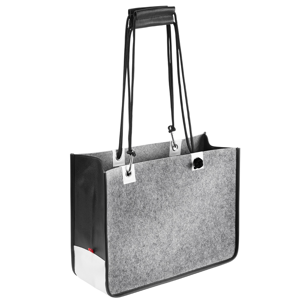 The bag features an interesting material mix of felt, truck tarp, and PU, and has an open main compartment. A metal eyelet for hand straps is framed in tarpaulin. The carrying handles are made of round-woven polyester, while the hand grips are crafted from elegant PU with a perforated design. The inner pocket is removable and made of 300D nylon. With a volume of 22.5 liters, the bag offers ample space and combines practical functionality with modern design.