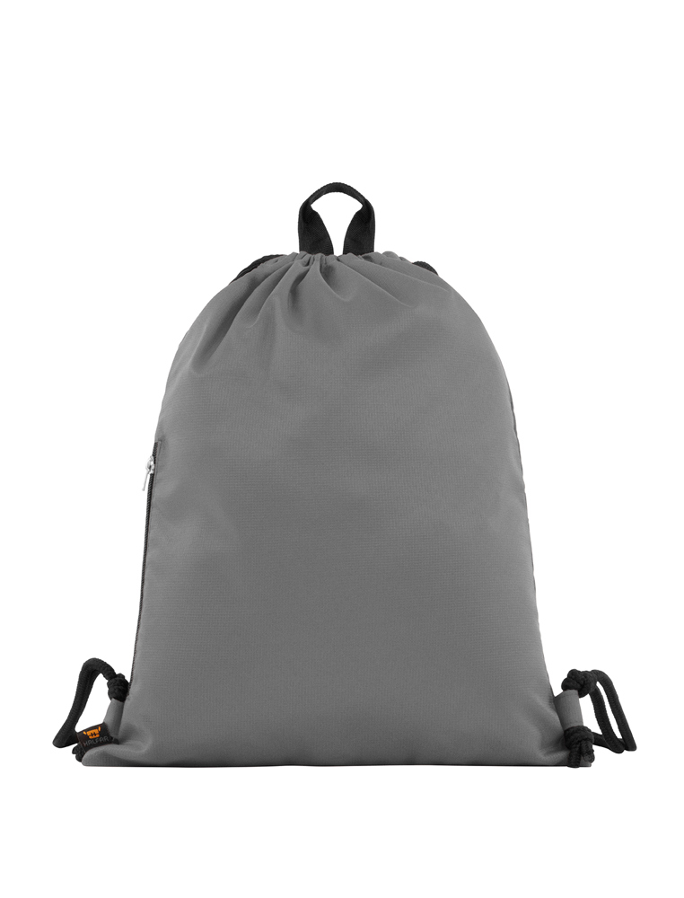 large drawstring backpack; main compartment with lateral zipper pocket; drawstring; carrying loop