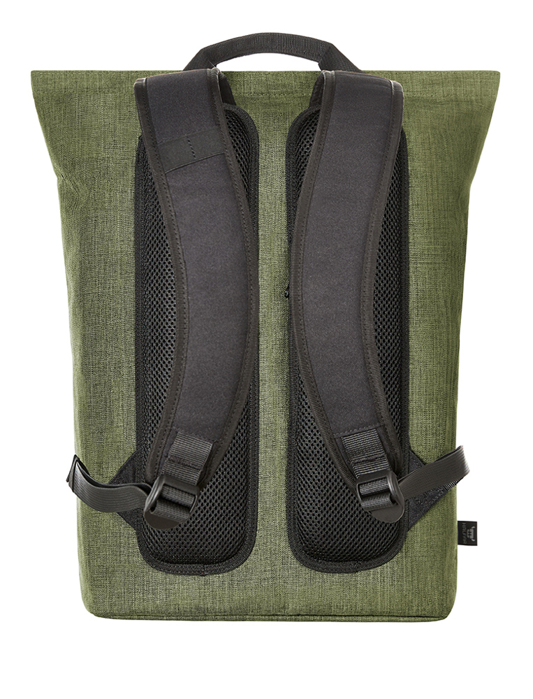 streamlined, modern backpack; main compartment with zip and padded notebook compartment; rPET outer material; high-quality metal accessories; padded base; elaborately padded back with hidden zip compartment; length-adjustable padded shoulder straps with rubber loops to attach items such as sunglasses; handles