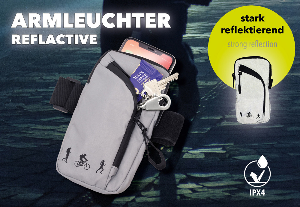 Arm bag with 2 zipped compartments, highly reflective, for sport and leisure, main compartment suitable for common smartphones, front compartment for e.g. wireless in-ear headphones, keys, cards, rubberized zippers, splash-proof (IPX4 waterproof grade), continuously adjustable velcro fastener with 2 elastics for elasticity, padded back, 100% polyester, polyester, black/grey