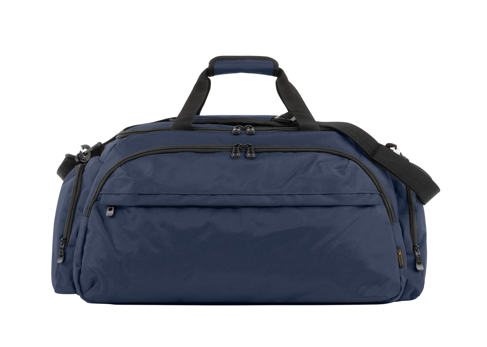 spacious main compartment with two-way zipper; 2 front pockets with zipper; 2 side pockets with zipper; removable, adjustable shoulder strap with comfortable shoulder pad; handles with grip cuffs; bottom studs
