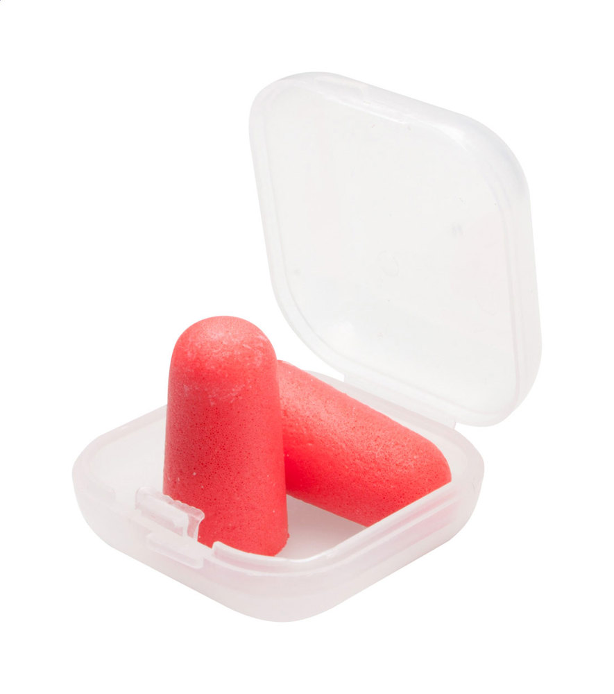 Coloured EVA earplugs in transparent plastic case.