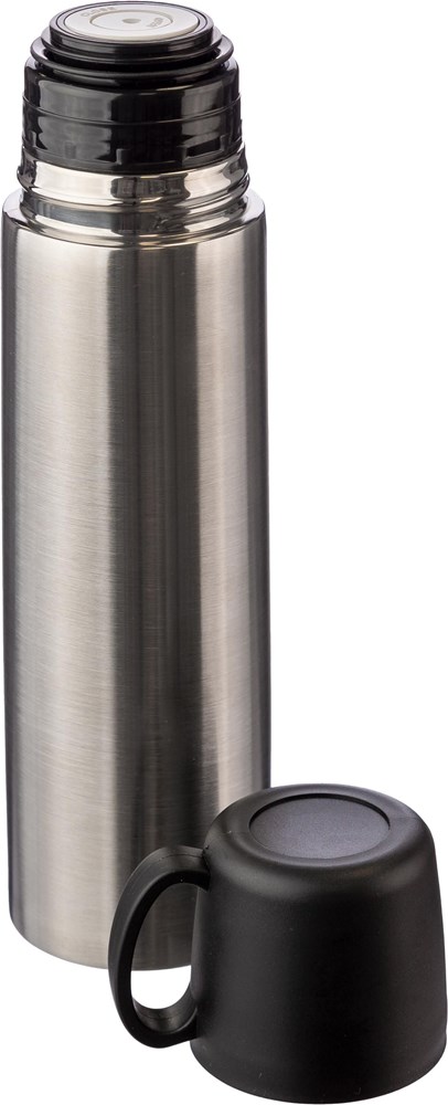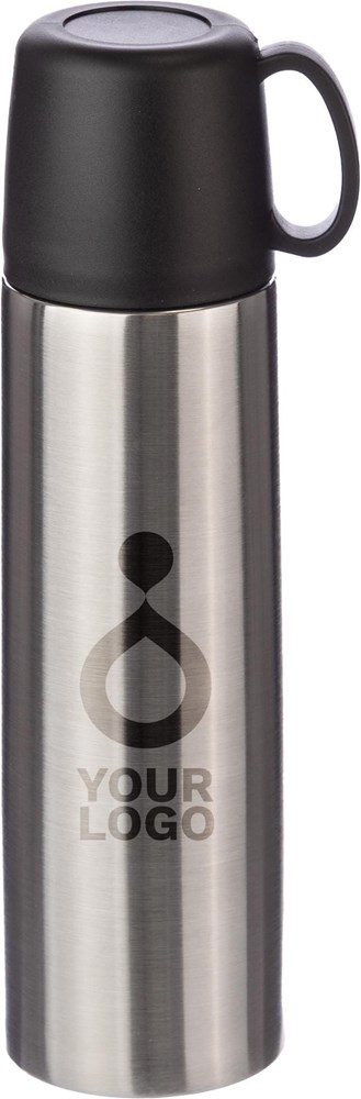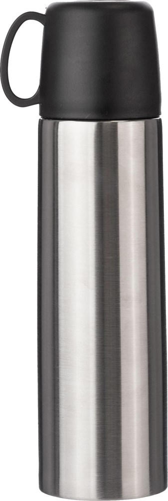 Stainless steel (s/s304) double-walled vacuum flask (500 ml) with PP cup/lid. Capacity of the cup is 130 ml. Packaged per piece in a brown carton box.
