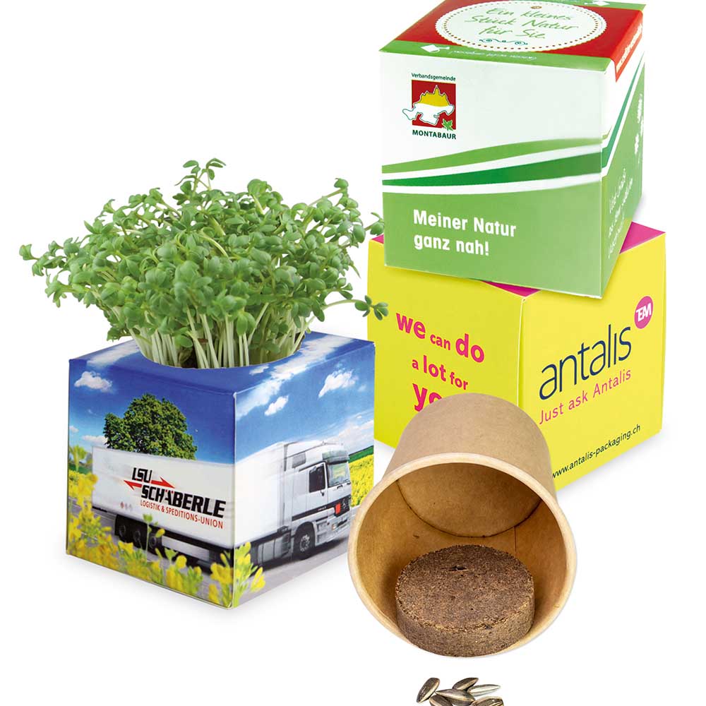 The secret of the flyweight is the waterproof cardboard cup inside. It contains a compost pellet as soil and a seed variety of your choice. The five sides of the surrounding cardboard cube, which can be completely customised, offer plenty of space for the advertising message. The planting instructions are on the bottom.