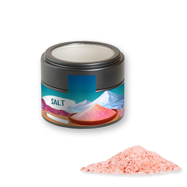 Pink crystal salt, ca. 110g, metal tin mini black with window
