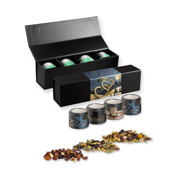 Various tea sorts , ca. 60-140g, gift set premium black with 4 metal tin mini with window