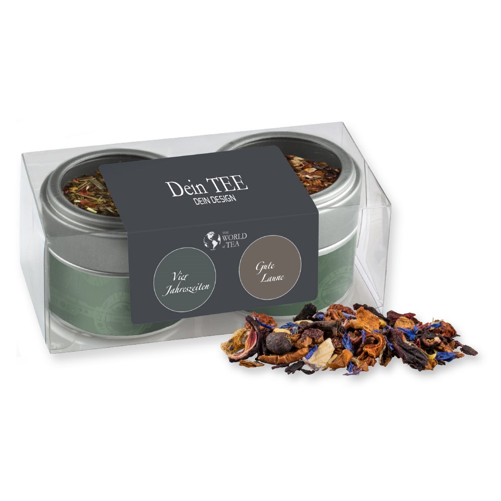 Various tea sorts , ca. 30-70g, 2-set metal tin mini with window with label