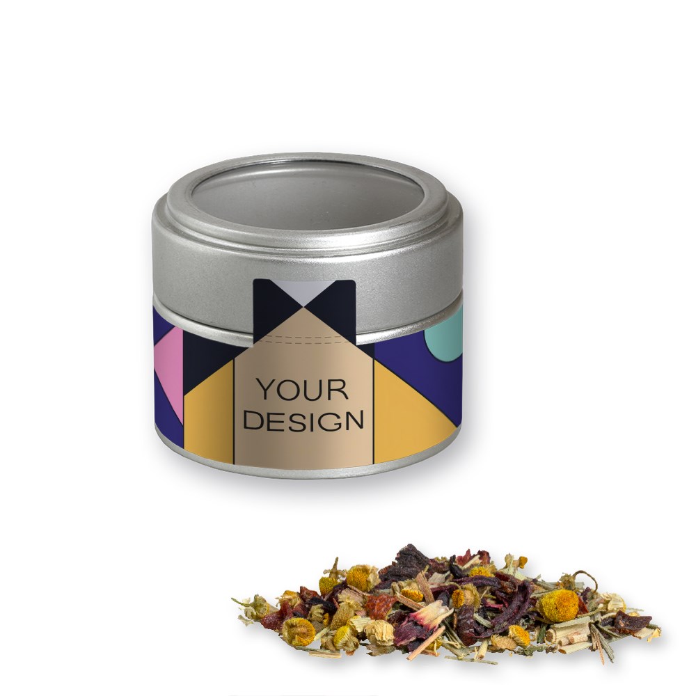 Herbal tea four seasons, ca. 15g, metal tin mini silver with window