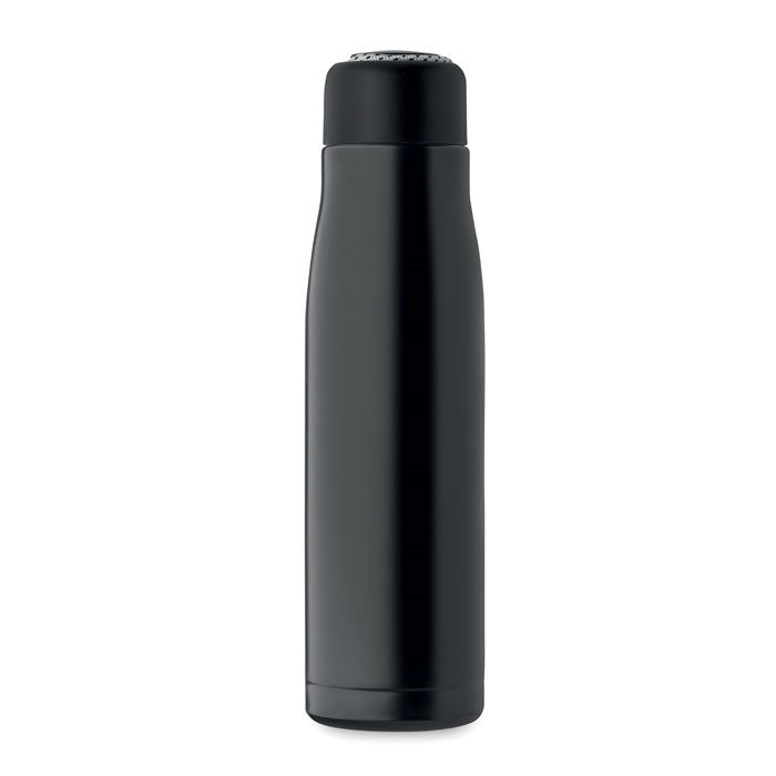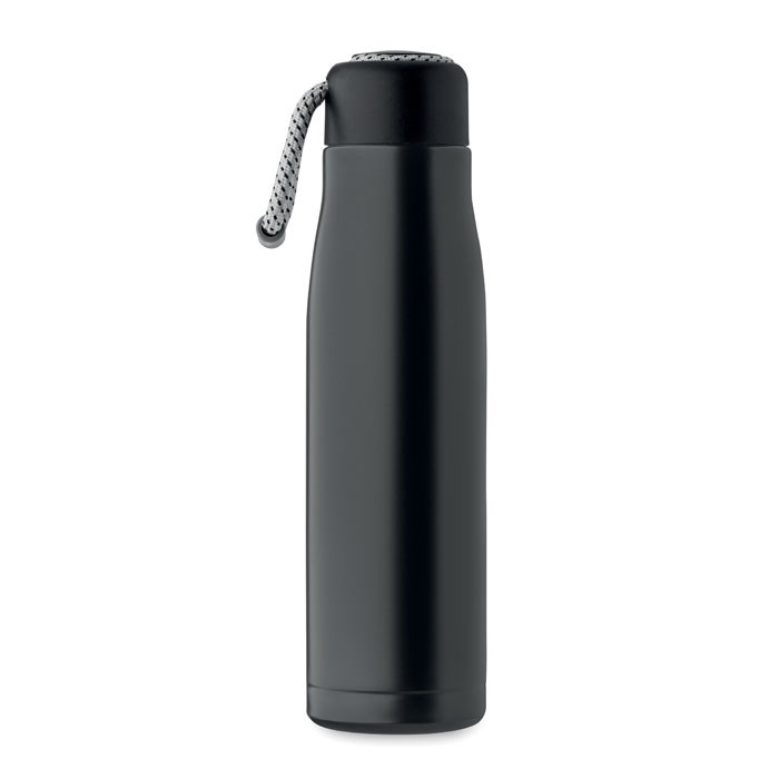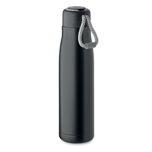 Double wall recycled stainless steel insulated vacuum bottle (90% recycled stainless steel and 10% stainless steel) with integrated cord grip on PP lid. Leak-free. Capacity: 500 ml.