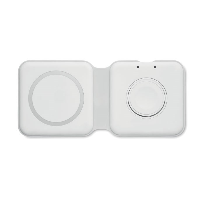2 in 1 foldable charging station in ABS. It includes a wireless charger 15W and smartwatch charger (Apple®only).