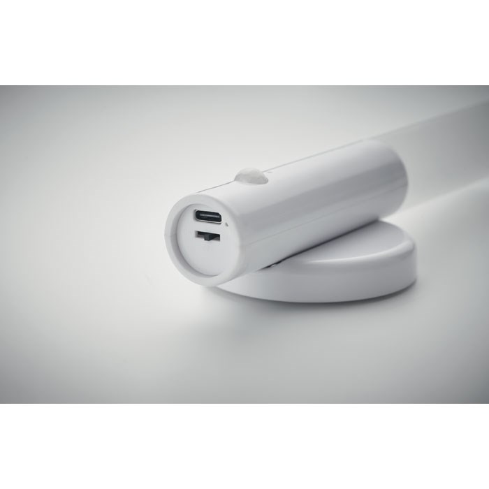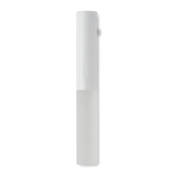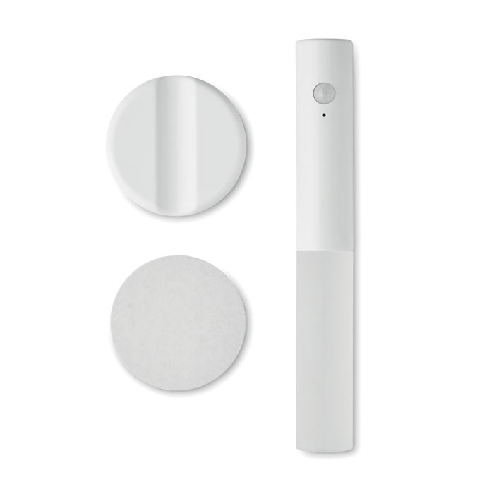Emergency sensor torch light in ABS and acrylic with magnetic base. Built-in 300 mAh rechargeable battery and charging cable. Base can be mounted on the wall with included 3M sticker.