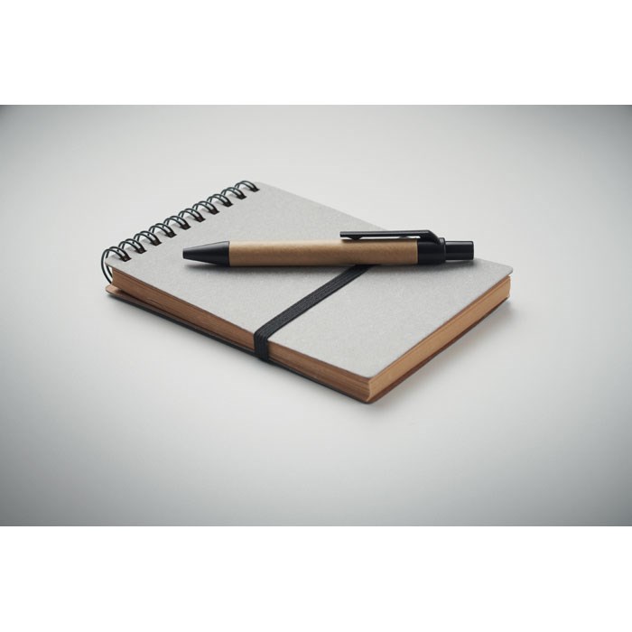 Recycled paper and PU cover (70% recycled paper and 30% PU) notebook. Twin-wire. 140 lined recycled paper pages (70 sheets). Matching push button ball pen in recycled carton and ABS parts. Blue ink. Elastic closure strap and pen holder. FSC®-certified | FSC MIX CREDIT, P7.1, FSC-C213206