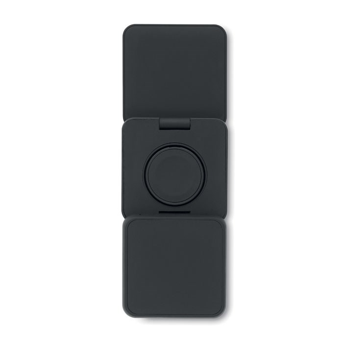 3 in 1 foldable charging station in rubberized recycled ABS. It includes a magnetic wireless charger 15W, smartwatch charger (Apple®only) and TWS charger.