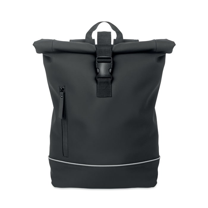 15 inch roll top laptop backpack in soft PU with padded back and base reinforcement with reflective strip. Waterproof zippered front pocket. 210D RPET polyester lining.