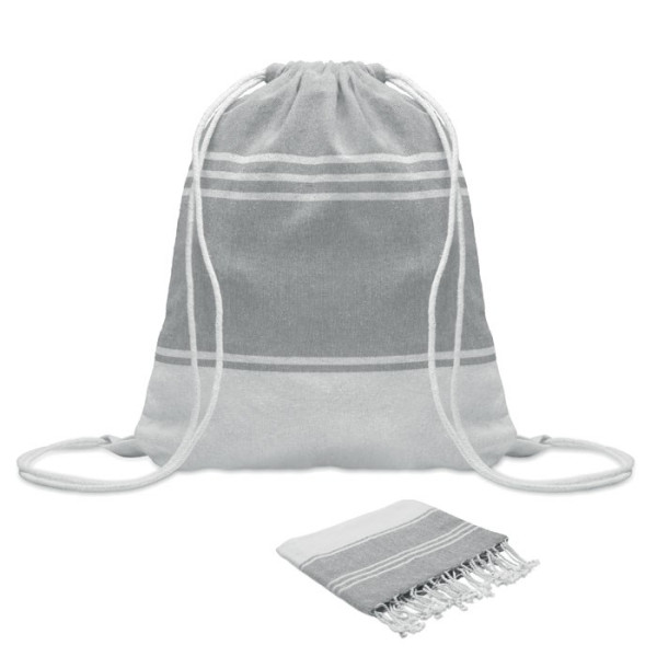 Set of hammam beach towel with drawstring bag. 70% cotton and 30% polyester 180 gr/m². 90x160 cm.