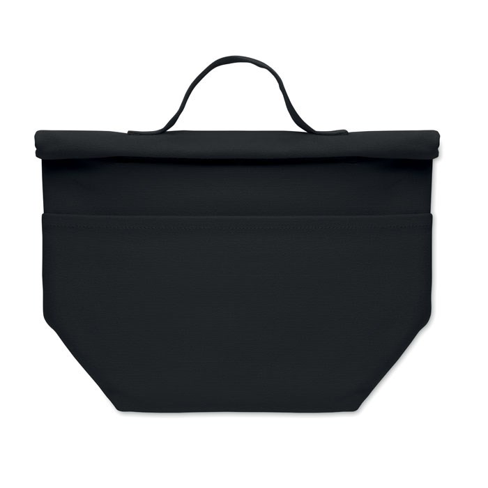 Recycled cotton (70% recycled cotton, 30% recycled polyester) insulated lunch cooler bag with rolltop hook and loop closure. Insulation: 3mm PE foam with 12C PEVA.