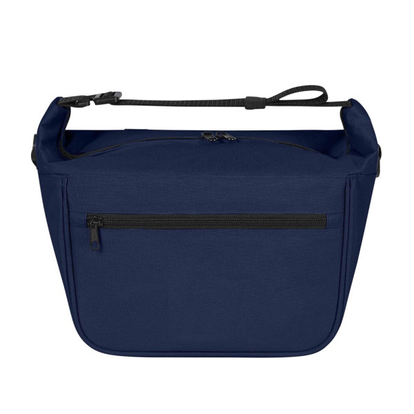 Stylish cooling bag; main compartment with 2-way zipper; generously padded; washable interior; detachable, adjustable strap on one side with rubber flap for strap attachment; D-rings on both sides for attachment of e.g.: optional shoulder strap* or keys; bottom feet; loops on back for attaching to bike handlebars