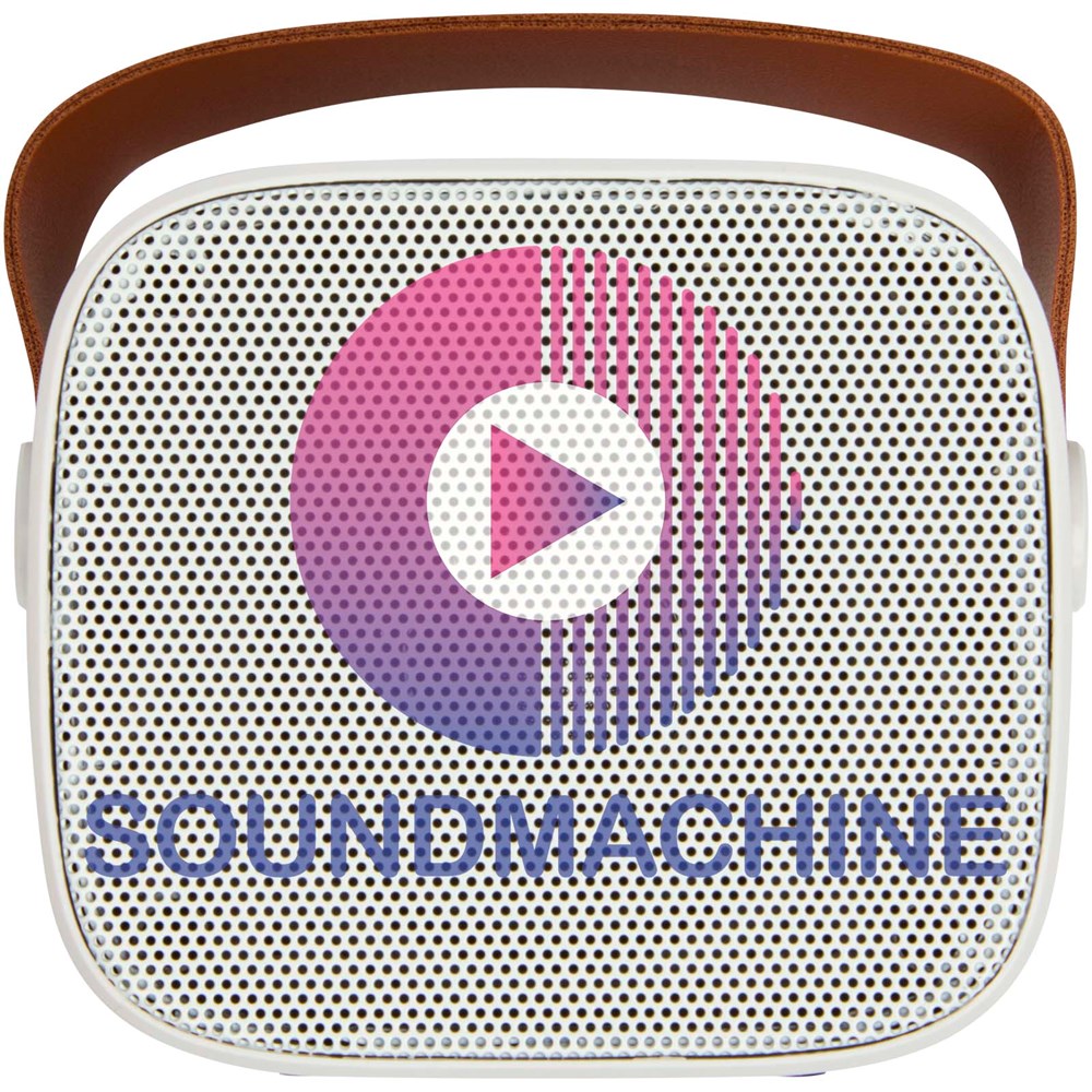 The Diya wireless speaker is made from recycled plastic and has a PU leather strap for easy portability. It delivers 3 watts of powerful sound and supports MP3 playback via Micro SD. Enjoy seamless connectivity with a line-in option and recharge effortlessly through the Type-C charging port. Playback time at max volume is approximately 3 hours and the speaker can be fully charged 0-100% in approximately 2 hours.