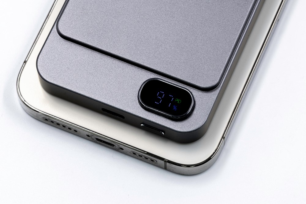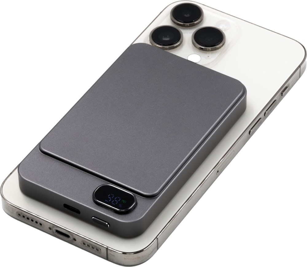 The Powerwave 5000 mAh power bank features a slim aluminum unibody design that fits easily in any pocket. With a 5,000 mAh capacity, it supports 15W magnetic wireless charging (MagSafe, Qi1 & Qi2) for easy, cable-free charging. It also includes a 20W (PD 3.0) USB-C port to charge laptops or other devices as needed. The LCD display shows battery level and charging status, while a smart chip offers protection from overcurrent, overcharging, overheating, and short-circuiting. Designed with a magnetic snap for quick, secure attachment.