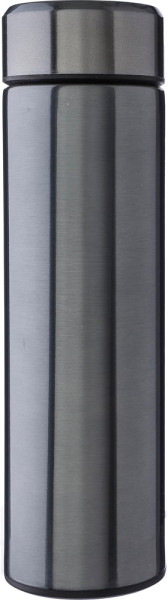 Stainless steel double-walled drinking bottle (425 ml) with a built-in, removable tea sieve. The interior is made of stainless steel 304, and the exterior is stainless steel 201. Individually packaged in a brown cardboard box.
