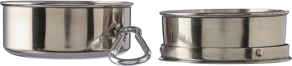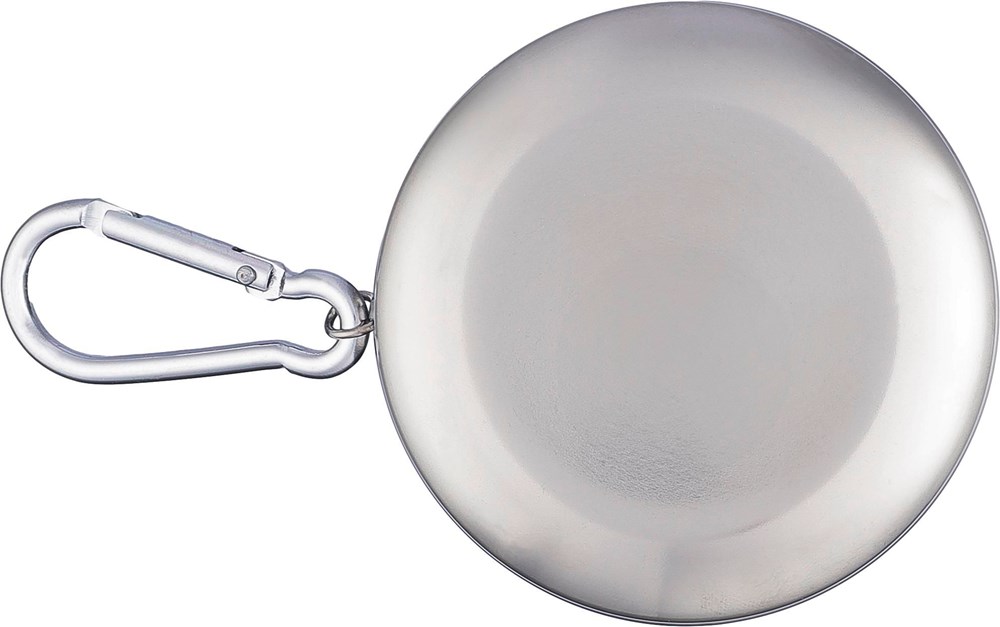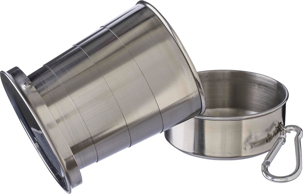 Stainless steel foldable cup (220 ml) with a metal carabiner. Individually packaged in a brown cardboard box.