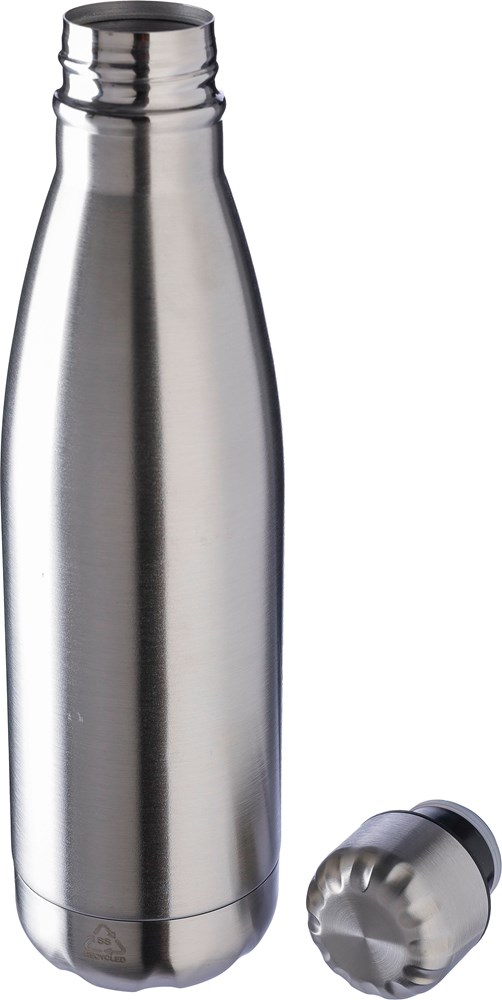 Recycled stainless steel single-walled flask (650 ml) with screw cap. Made from stainless steel 304. Recycled logo engraved on the flask. Individually packaged in a brown cardboard box.