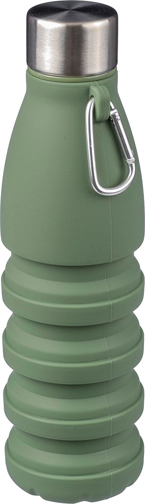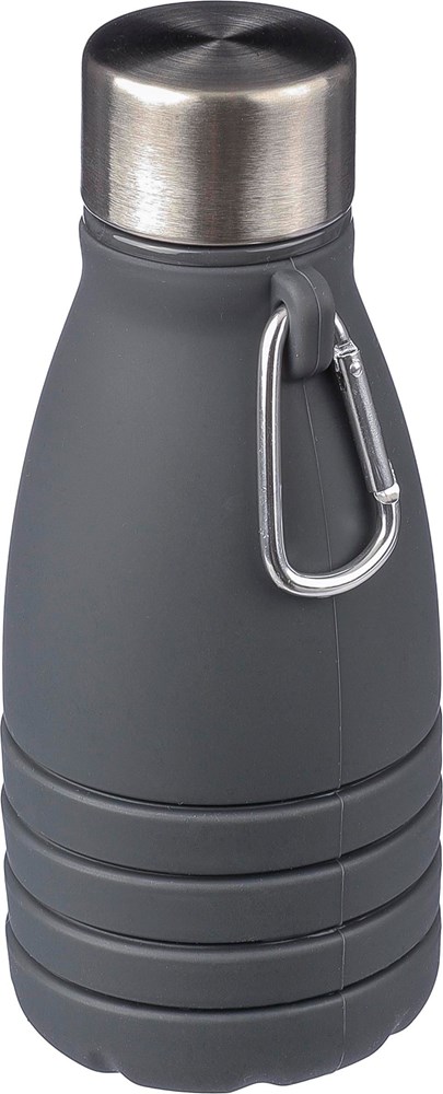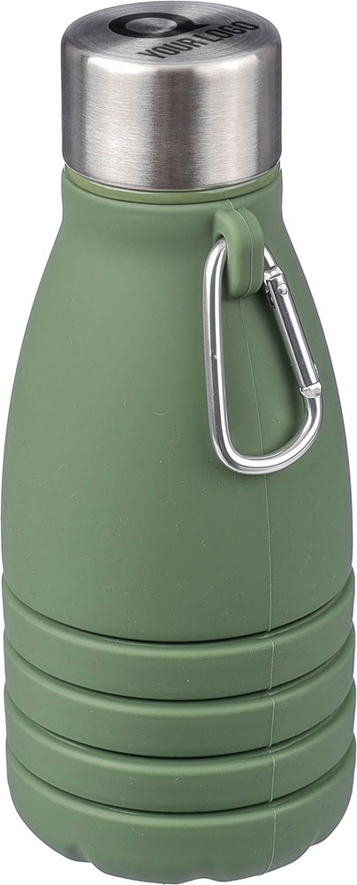 Silicone foldable drinking bottle (550 ml) with a stainless steel lid and aluminum carabiner hook. Folded
