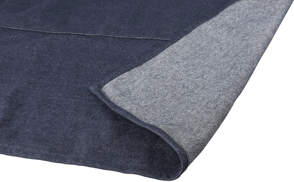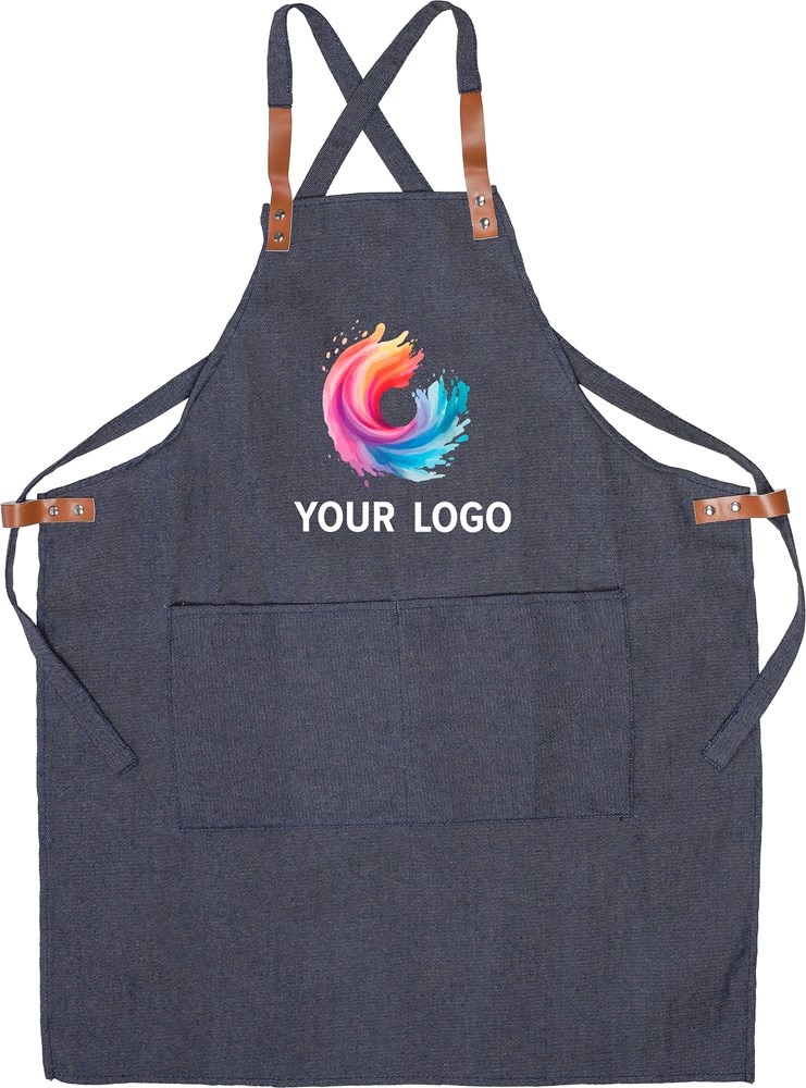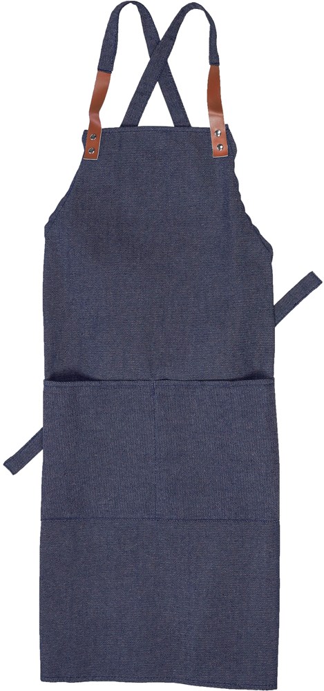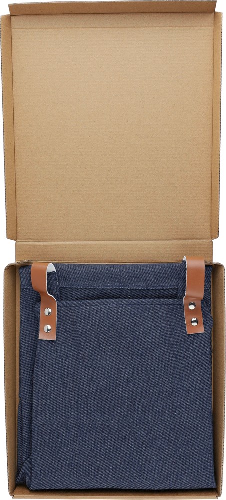 Denim (280 gsm) apron with shoulder straps and two front pockets. The denim is made from 65% polyester and 35% cotton. This apron does not have a neck strap, only shoulder straps. Denim color fastness is up to 2-3 levels. Individually packaged in a brown cardboard gift box.