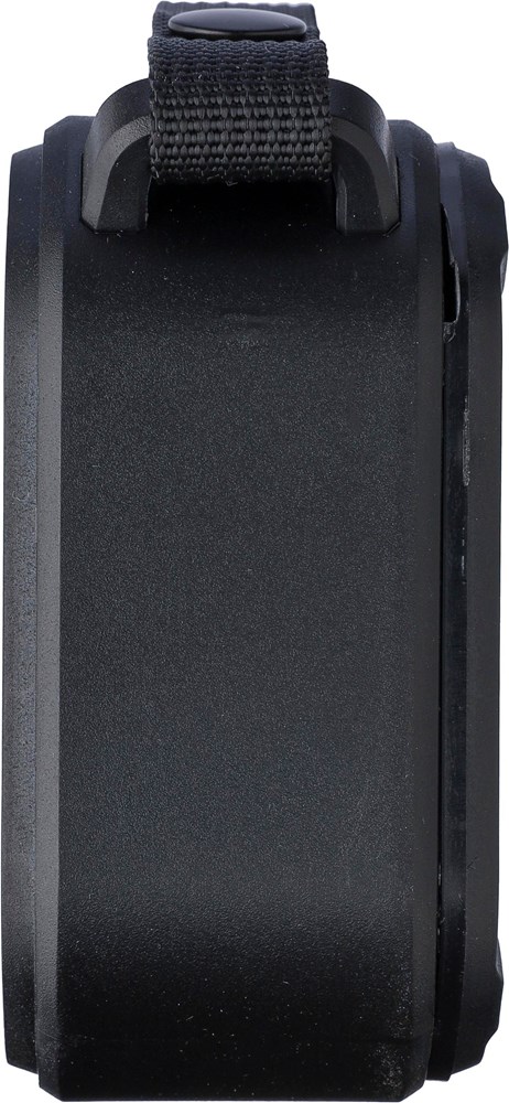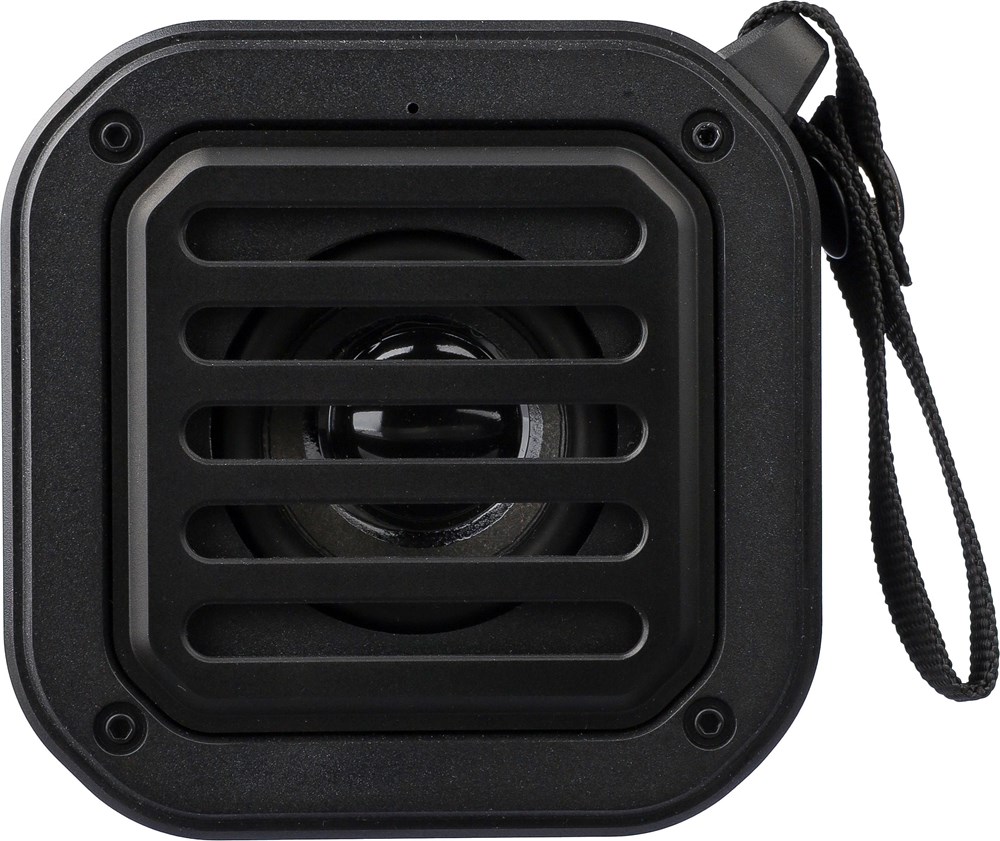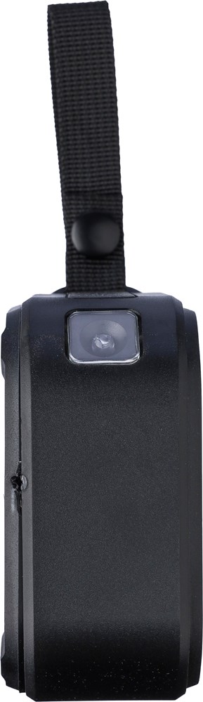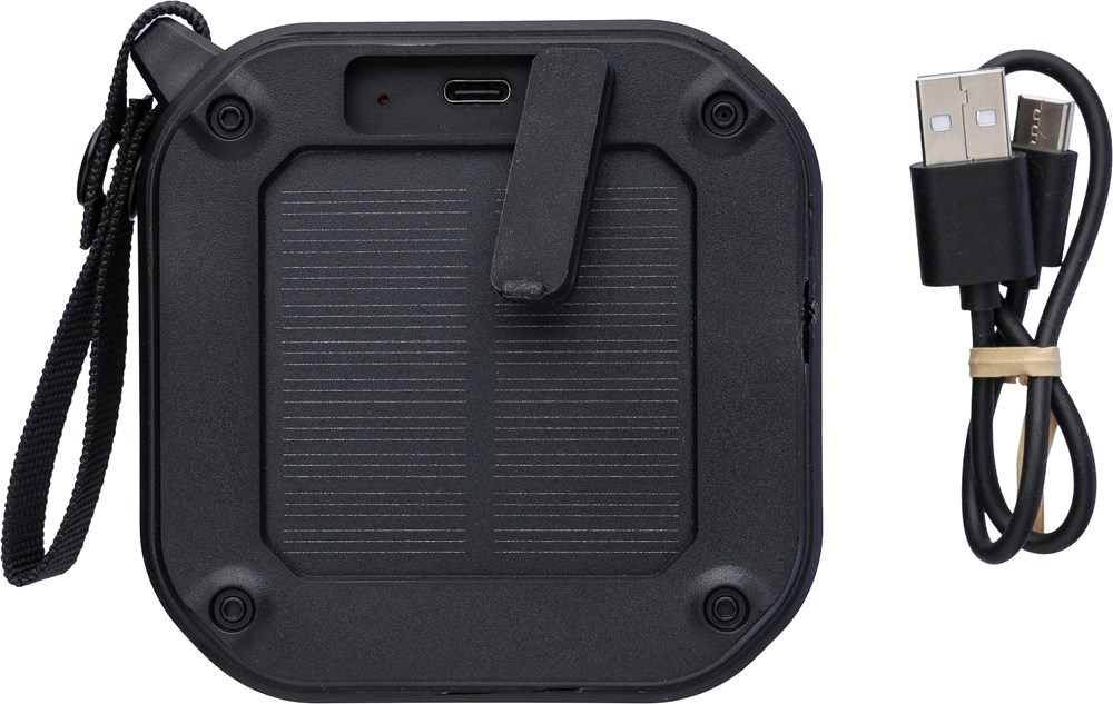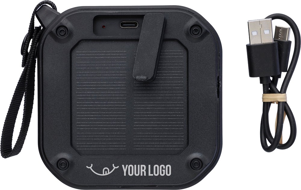 Recycled ABS outdoor speaker with wristband and carabiner. IPX6 rated. 3W output, DC 5V input, 400mAh built-in rechargeable battery, with 4 hours of playing time. Working distance of 15-20 meters, signal-to-noise ratio of 75 dB. Frequency range: 100 Hz to 20 kHz. Includes 30 cm Type-C charging cable, built-in LED flashlight (30 lumens), and solar panel to extend usage. Wireless connection technology: 5.3. Individually packaged in a brown cardboard box.