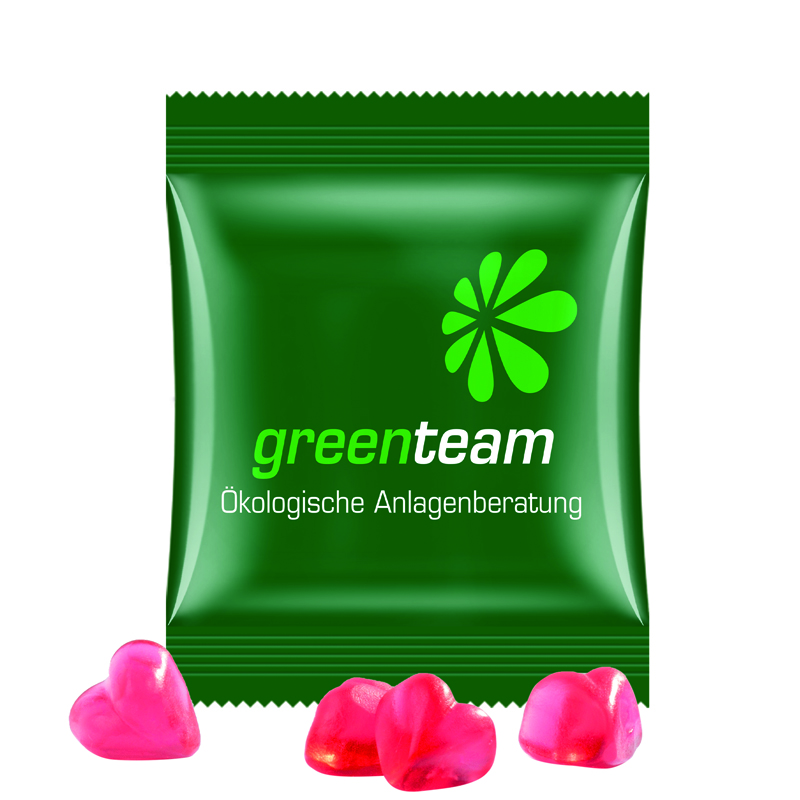 Trolli fruit jelly gums in a bag made of white foil, compostable, individually printed. Content: Trolli fruit jelly gums heart, Premium quality with 10% fruit juice content and strawberry taste, 15 g