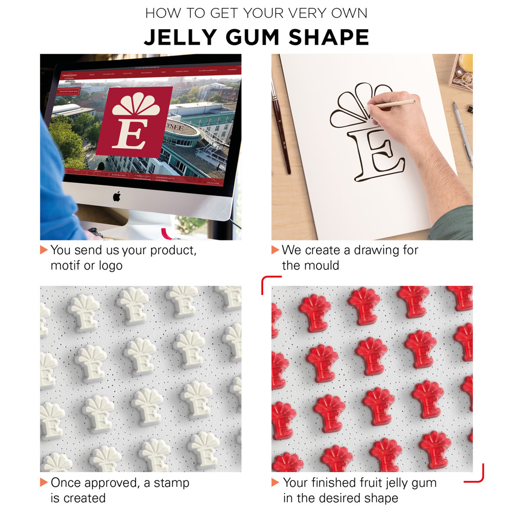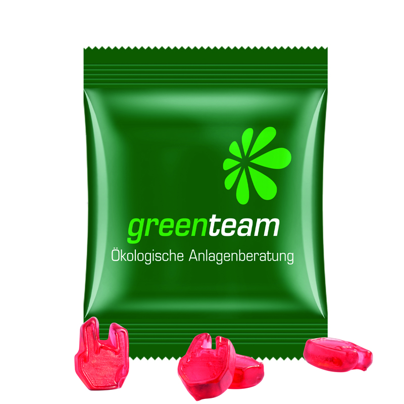 Trolli fruit jelly gums special shape in a bag made of white foil, compostable, individually printed. Content: Trolli fruit jelly gums with special shapes with 10% fruit juice, in premium quality with 10 % fruit juice content, colourful mixture (green, red, orange, yellow) Fruit jelly gum size: max. 20 x 20 mm Customised shapes with exquisite fruit juice quality available upon request, 15 g