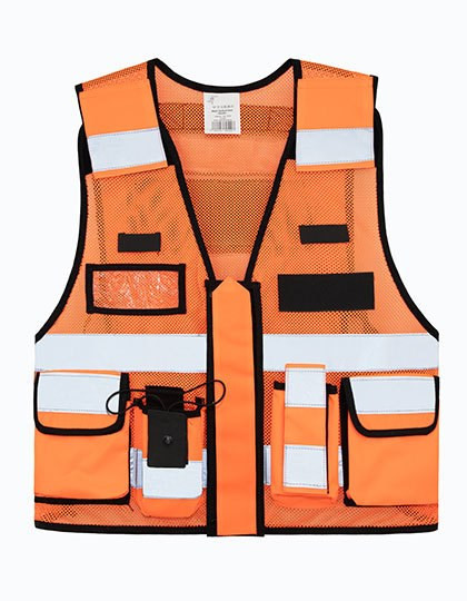 Mesh tactical vest with striking reflective stripes | Ideal for hot environments | Full-length zip at the front, reinforced by a flap | Flexible use thanks to various pockets | Various interchangeable patches that can also be used as printing areas | Tear-away label | Practical double sizes with hook-and-loop fasteners for individual adjustment
