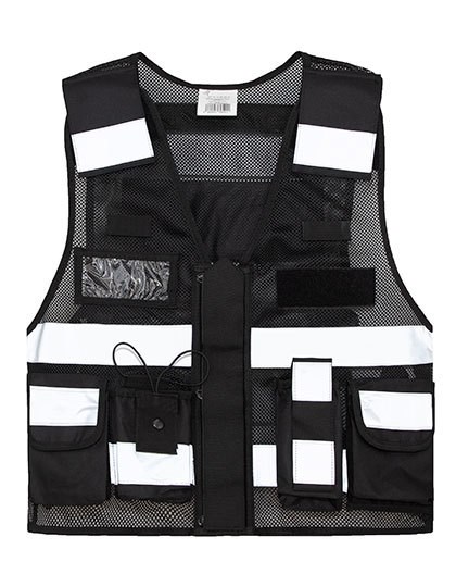 Mesh tactical vest with striking reflective stripes | Ideal for hot environments | Full-length zip at the front, reinforced by a flap | Flexible use thanks to various pockets | Various interchangeable patches that can also be used as printing areas | Tear-away label | Practical double sizes with hook-and-loop fasteners for individual adjustment
