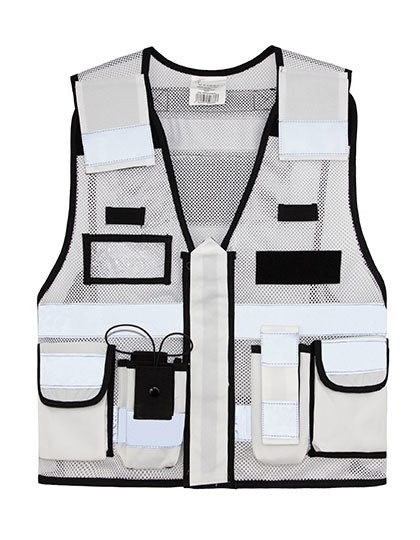 Mesh tactical vest with striking reflective stripes | Ideal for hot environments | Full-length zip at the front, reinforced by a flap | Flexible use thanks to various pockets | Various interchangeable patches that can also be used as printing areas | Tear-away label | Practical double sizes with hook-and-loop fasteners for individual adjustment