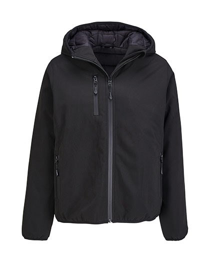 Polar fleece lining: 100% recycled polyester, Lining: 100% nylon, Padding: 100% recycled polyester | 3-layer softshell | Waterproof and breathable 5000 mm membrane | Fully padded winter softshell | Hood with elasticated opening | Front fastening, side and chest pockets with black waterproof nylon zip | 3 inside pockets | Zip for customisation | Tone-on-tone elasticated bias binding at cuffs and bottom