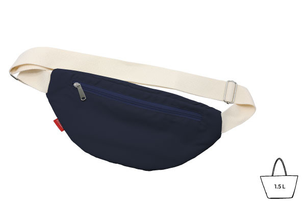 Bum bag in polycotton weighing 160g/m². 2 storage spaces with zipped closure, one of which is at the back of this belt bag. Fully lined interiors. Adjustable strap in cotton twill. Capacity: 1,5 L.