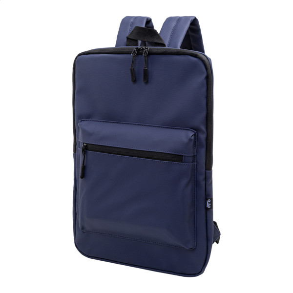 Waterproof RPET slim laptop backpack with zipped laptop (15") compartment and zipped front pocket. With padded back and shoulder straps. PU coated 600D RPET polyester, with distinctive RPET label.