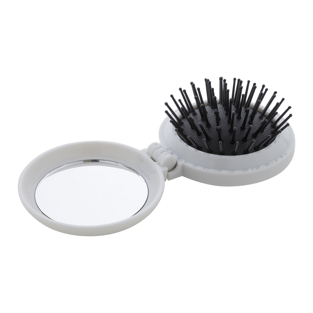 Foldable, recycled ABS hairbrush with pocket mirror.