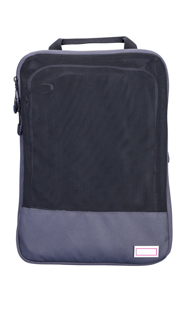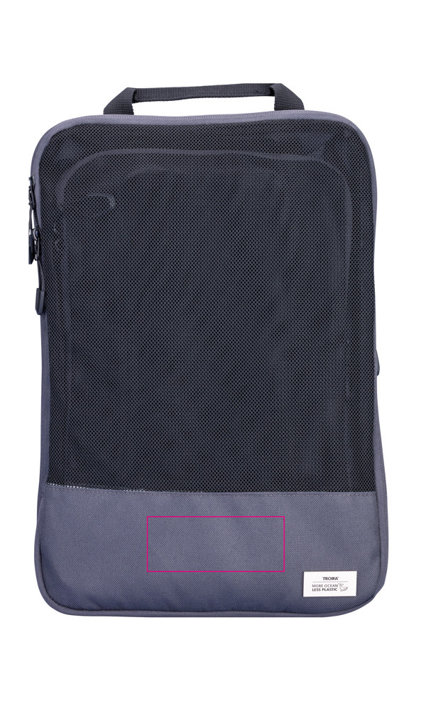 Set of travel compression packing cubes made from recycled ocean plastic, 3 packing bags with zip closures and additional compression zip closure for packing clothes wrinkle-free in a space-saving, orderly way in suitcase & backpack, 3 sizes: L (shirts & pants), M (shirts), S (underwear & socks), each with mesh window and carrying handle, 100% rPET, recycled ocean plastic, dark grey